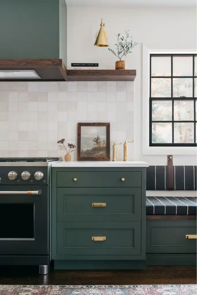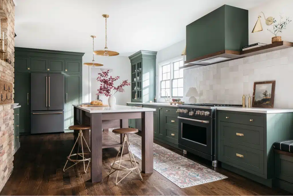 A bold yet timeless renovation where deep green cabinetry, natural textures, and golden accents redefine the heart of the home.