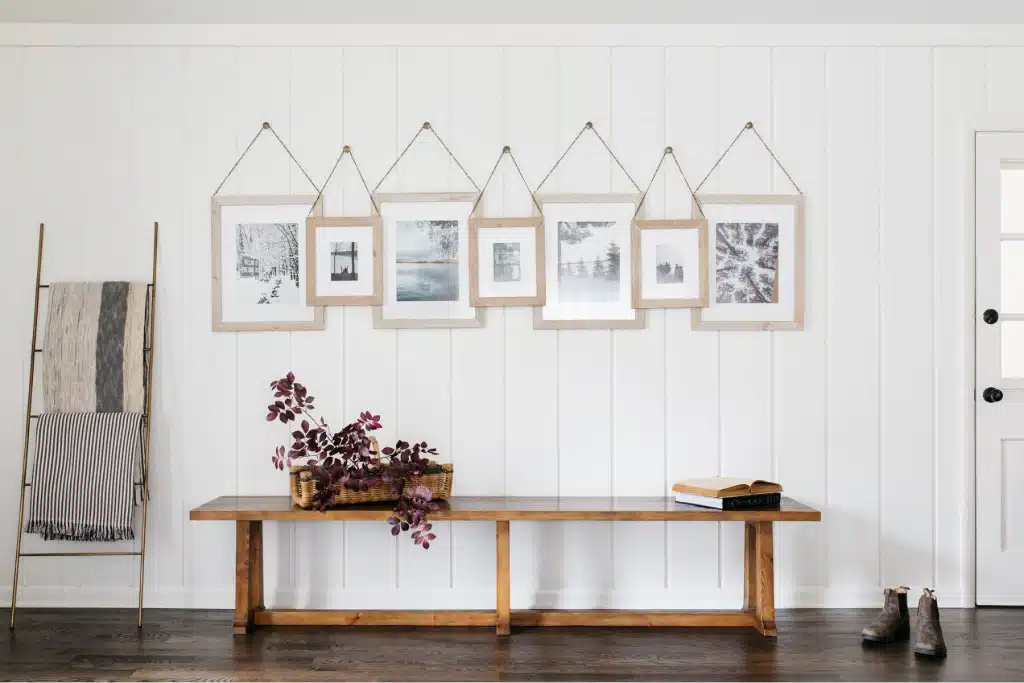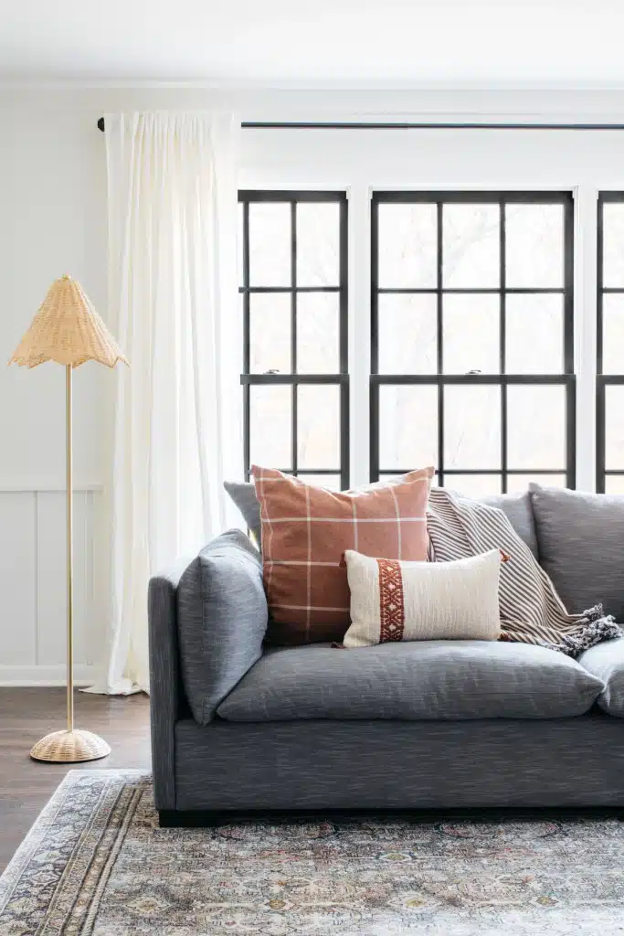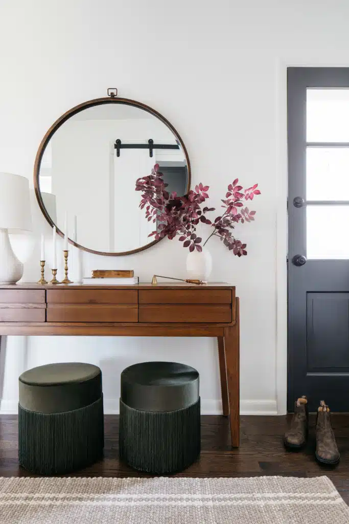 A full main-floor renovation in this St. Charles interior design project turned the kitchen, dining, living, and mudrooms into spaces filled with warmth and charm. The kitchen stands out with deep green custom cabinets and a walnut island featuring a beautiful reeded detail. A cozy banquette invites gathering beside a curated gallery wall. Natural clay tile pairs with the texture of exposed brick, while soft golden lighting adds a timeless glow. The result is a home full of character and lasting beauty—where simple details, natural finishes, and layered textures create spaces that feel welcoming, relaxed, and made for everyday living.