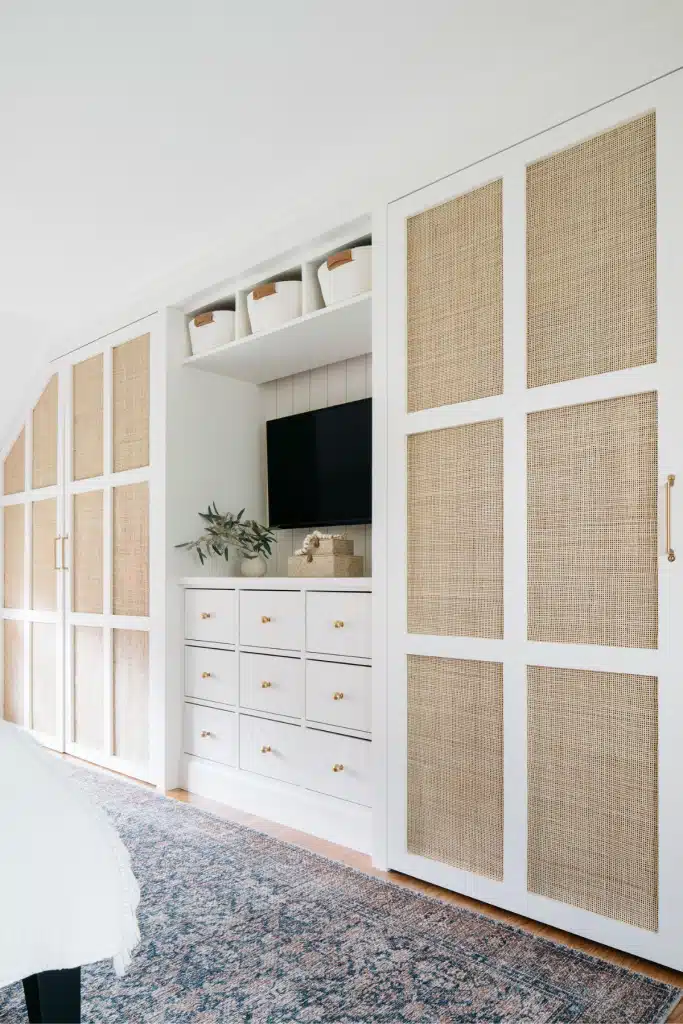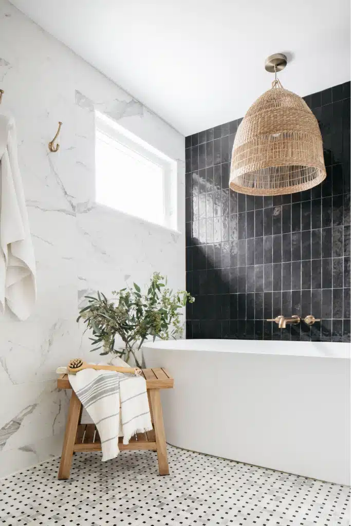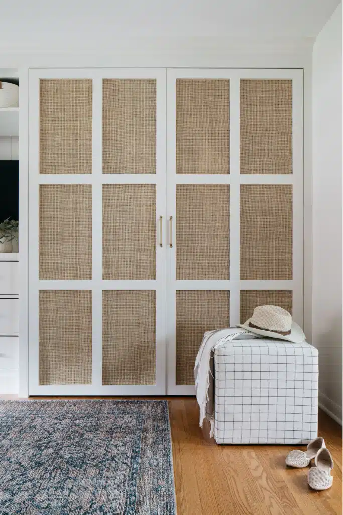 This primary suite was reimagined for ease, comfort, and quiet luxury. A once-challenging layout now flows seamlessly from bedroom to custom closets and a spa-like bath, where a freestanding tub and generous shower anchor the wet room. Layered materials—matte black fixtures, veined marble, and warm rattan—create a space that feels timeless, calm, and effortlessly refined.